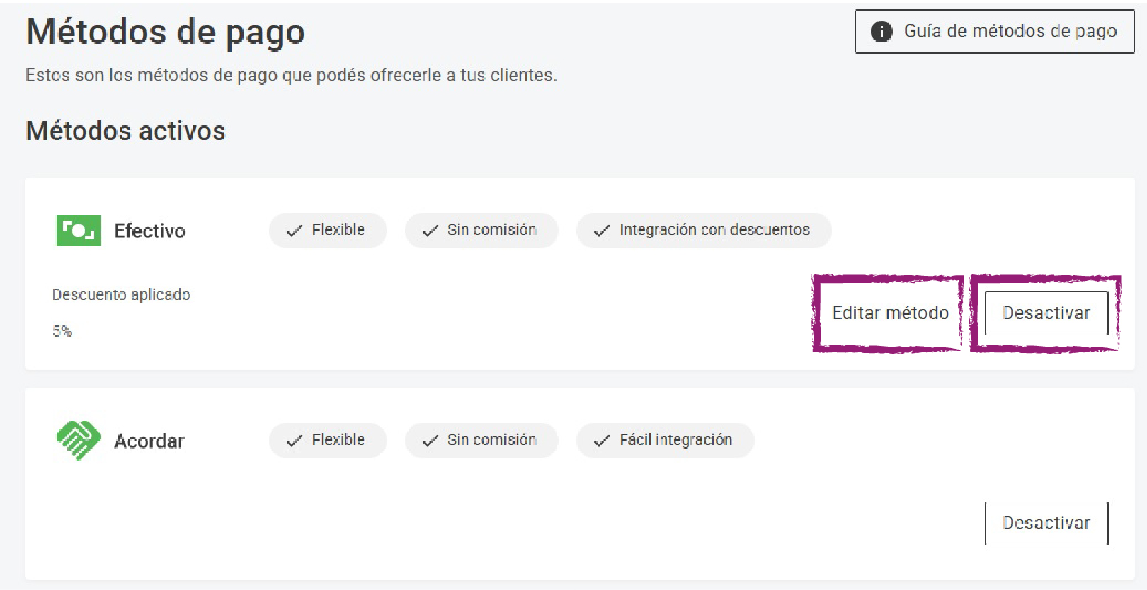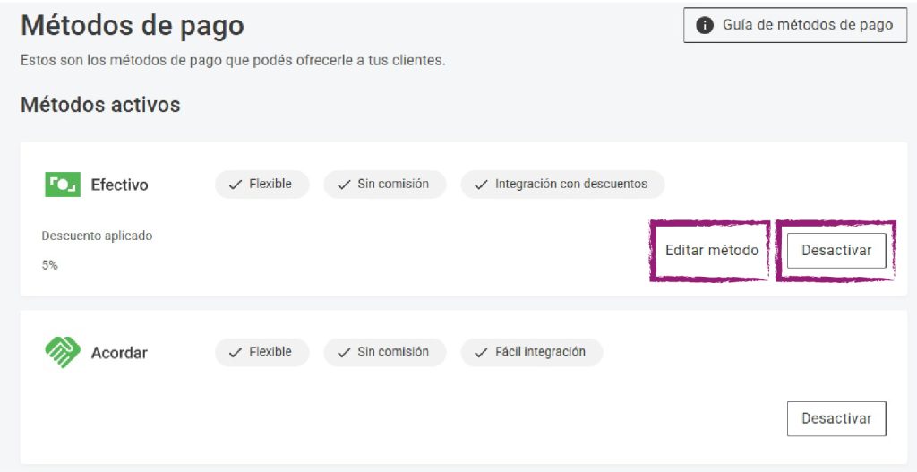 - Modificar otros métodos de pago, como efectivo, según las configuraciones disponibles.